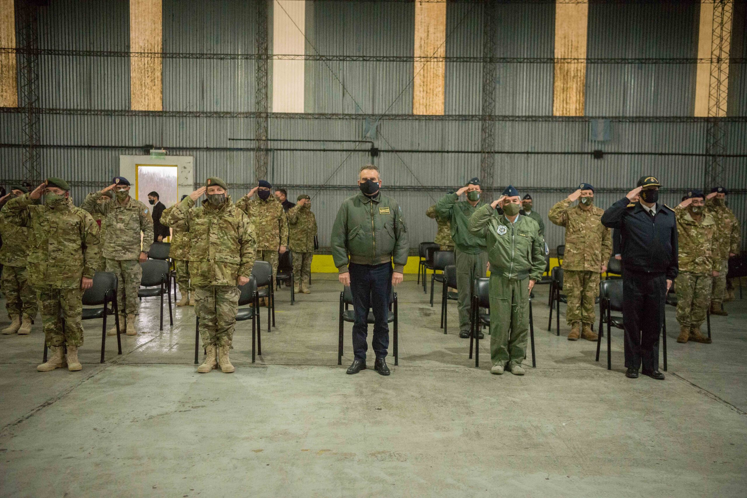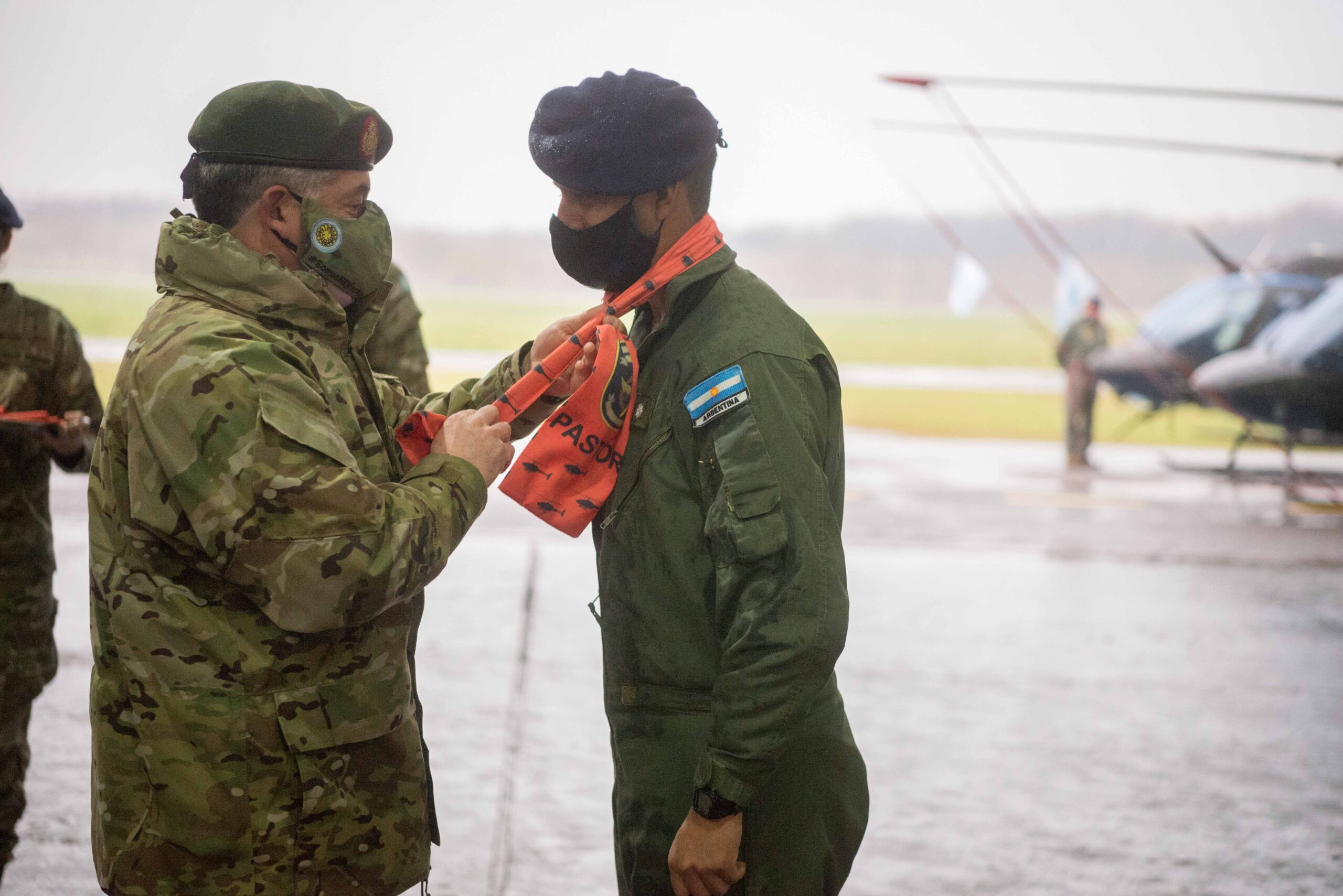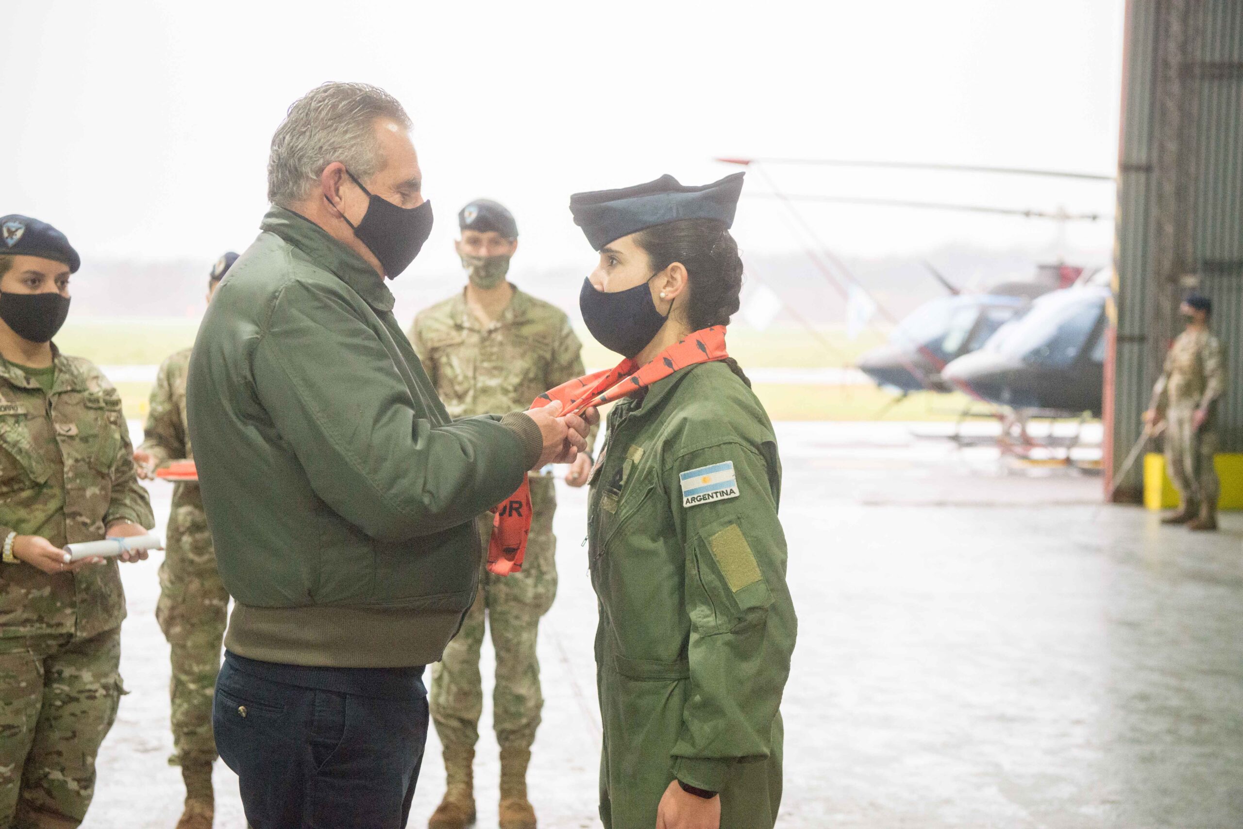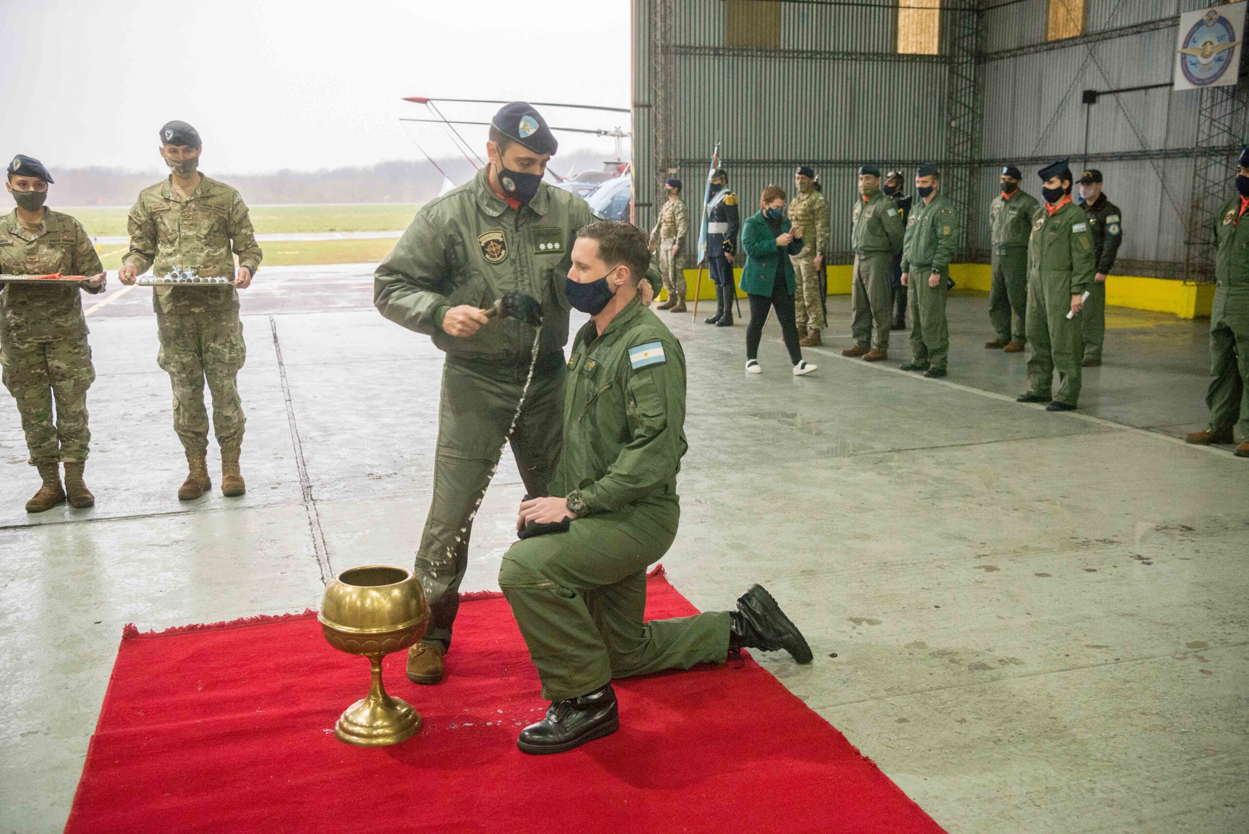 La ceremonia comenzó con la presentación del personal formado al ministro de Defensa, tras lo cual se entonó el Himno Nacional Argentino, y el capellán del Comando de Aviación de Ejército bendijo los diplomas y pañuelos que fueron entregados por las autoridades presentes a los oficiales del Curso Básico Conjunto de Pilotos de Helicóptero 2021 y del Curso Básico de la Especialidad Piloto de Ejército 2020: